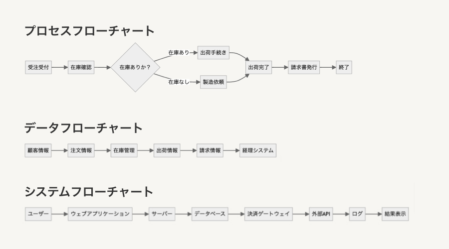 フローチャートは、その用途や目的に応じてさまざまな形式が存在します。ここでは、特に一般的な3種類のフローチャート、すなわちプロセスフローチャート、データフローチャート、システムフローチャートについて詳しく解説します。